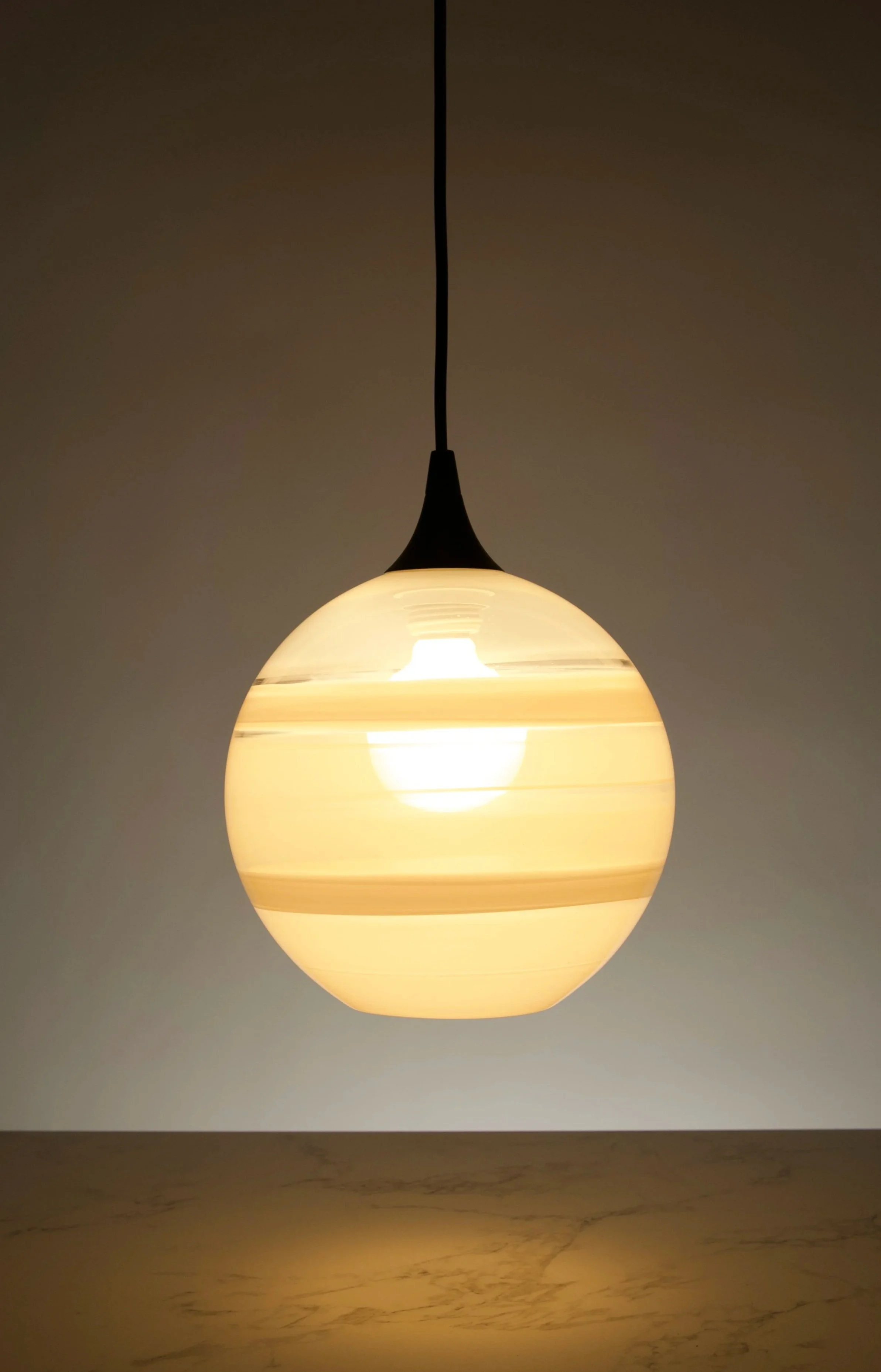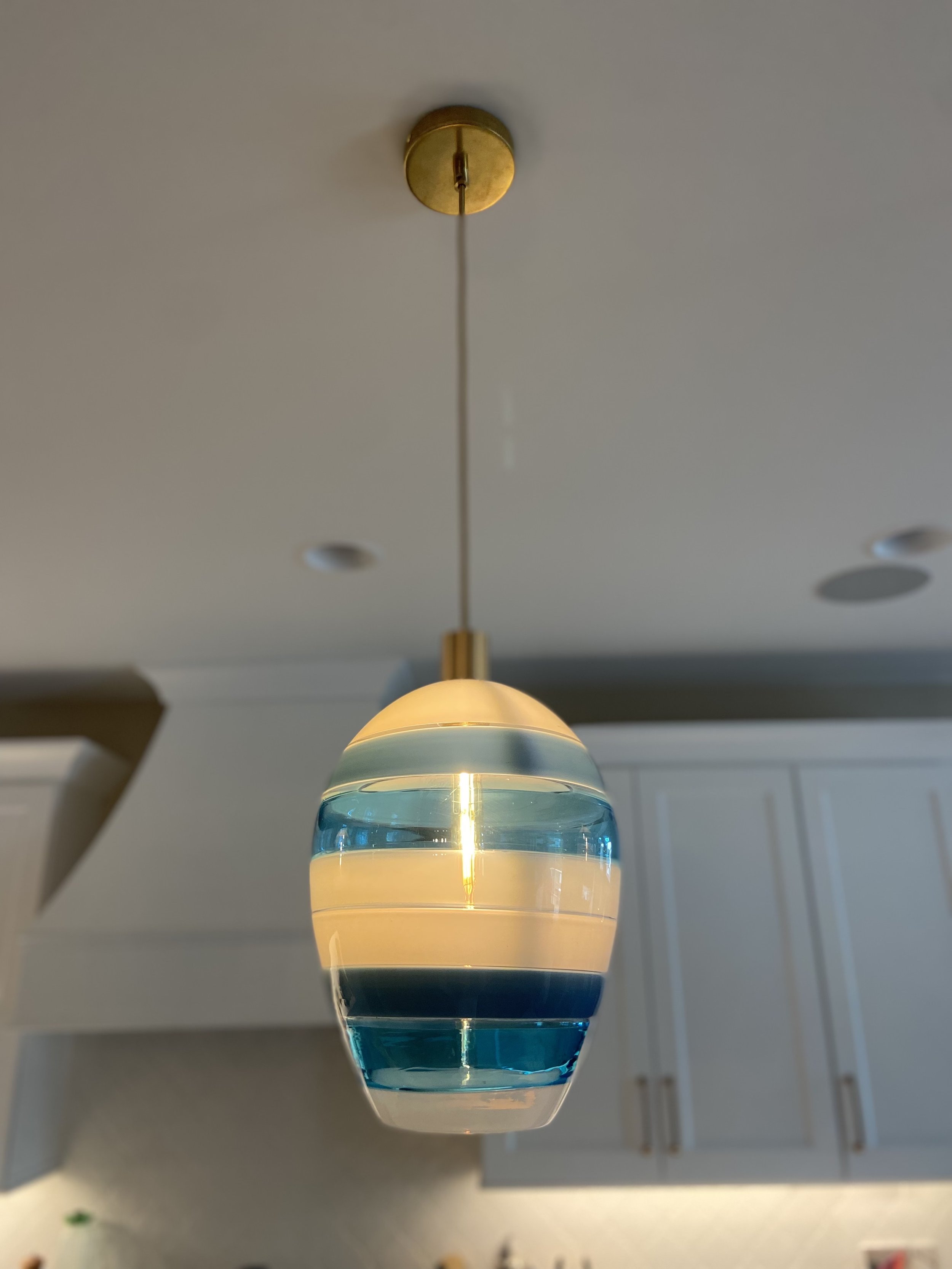 The Encalmo Pendants consist of eight different bands of color attached together while the glass is hot. This design offers full customization with the entire spectrum of color, as well as both transparent and opaque glass. This design is available in our five shapes: Cylinder, Cone, Sphere, Bell, and Bean.